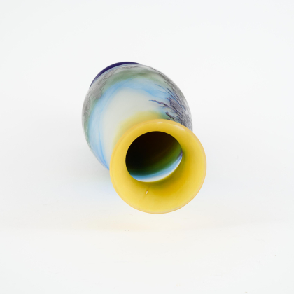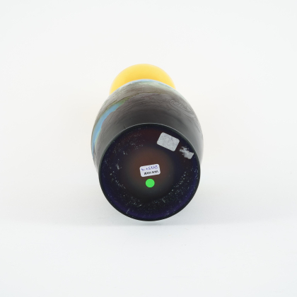 Material: Farbloses Glas, gelbe Pulvereinschmelzungen, blauer und violetter Überfang, Ätzdekor.