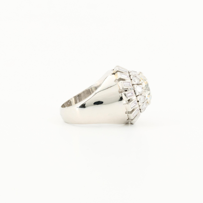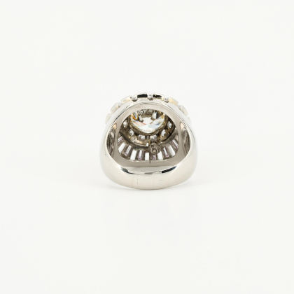 Diamanten: 1 Brillant (modifiziert) 5,70 ct., H-I/SI, Fluoreszenz: keine, 28 Diamanten im Brillant-, und Baguette-Schliff zus. ca. 2,8 ct., F-G/VVS-VS, einzelne Steine fluoreszieren.