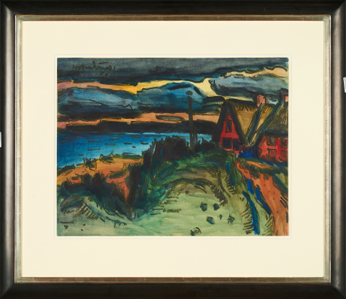 Ernst Mollenhauer Deutschland Expressionismus Moderne Kunst Unikate 1960er Modellrahmen (79 x 91cm) Landschaft, Dorf Papierarbeit Öl Küste