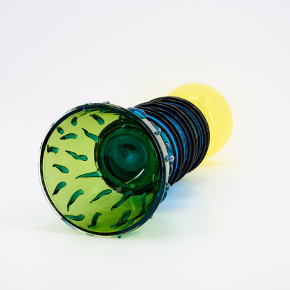 Technik: Überfangglas, hellgelb, blau, hellgrün mit blauen und violetten Aufschmelzungen.