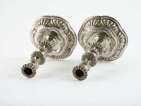 Beschreibung: Die ausladenden, sechspassigen Füße mit dichtem, getriebenem Pfeifendekor, dazwischen