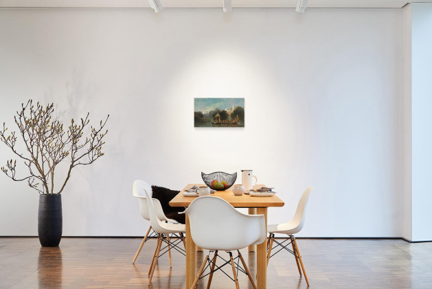 Als ein großes Ausnahmetalent der Malerei des 19. Jh. hat Félix Ziem nach seinem Tod ein umfangreiches und vielschichtiges Werk hinterlassen, das heute in großen Teilen im Museum in Martigues aufbewahrt wird. Er hat sich als Autodidakt aus einfachen Verhältnissen einen großen wirtschaftlichen Reichtum erarbeiten können, zeigt eine zeitlose impressionistische Auffassung der Malerei - mit den Malerkollegen der Barbizonschule, zu der er häufig gezählt wird, hat er gebrochen, da sie ihm zu dogmatisch waren - und bringt als weitgereister Weltenbürger auch exotische Themen auf die Leinwand. Neben den vielzähligen Venedigansichten sind dies eben auch Arbeiten aus Fernost, wie die hier vorgestellte thailändische Fürstenbarkasse. Sie verbindet seine Vorliebe für maritime Motive mit der Neugier des Publikums auf die unbekannte Ferne.