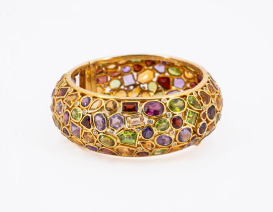 Edelsteine: Viele verschiedene Farbsteine in unterschiedlichen Schliffausführungen, unter anderem Amethyst, Peridot, Citrin, Granat.