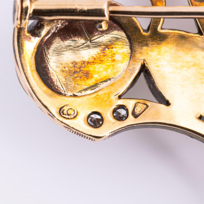 Diamanten: 5 unrunde Diamanten im Rosen-Schliff Ø ca. 5,4 - 9,1 x 5,2 - 6,9 mm, foliert, 24 Brillanten und Achtkant-Diamanten zus. ca. 0,3 ct., K-M/P.