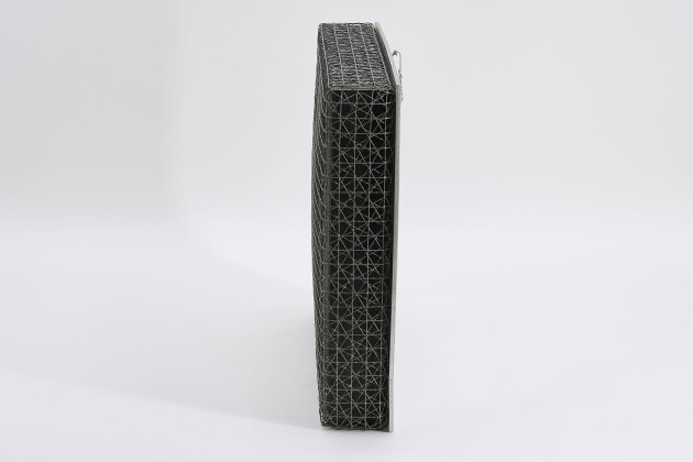 Technik: Metallgitter um schwarz gefasstes Holz auf Aluminium.