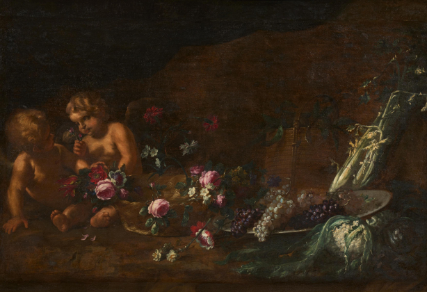 Los 686 | Francesca Vicenzina | Stillleben mit Blumenkorb, Weintrauben und Putten