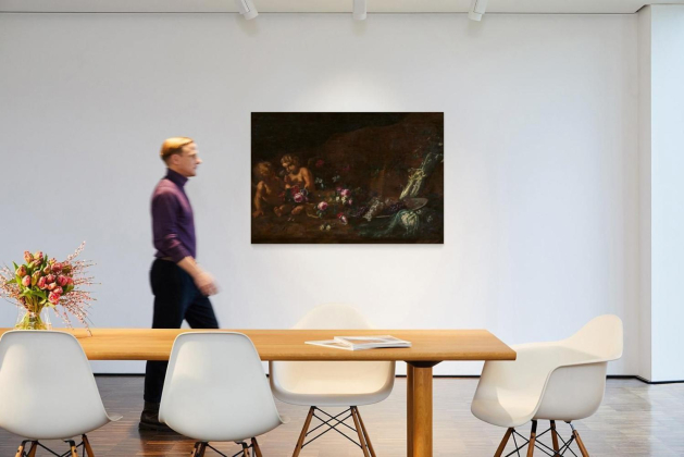 Titel: Stillleben mit Blumenkorb, Weintrauben und Putten.