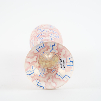 Beschreibung: Auf eingezogenem Rundfuß keulenförmiger Korpus. Umlaufend dekoriert mit stilisierten