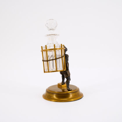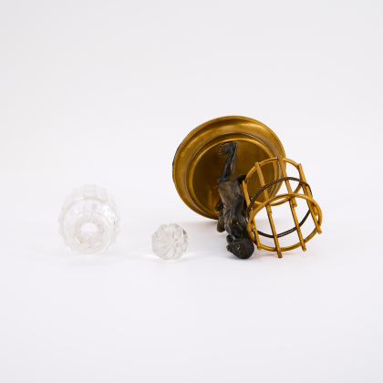 Technik: Bronze patiniert, Eisen vergoldet. Glasflakon. Fuß gefüllt.