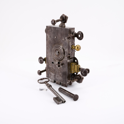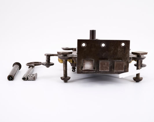Beschreibung: Türschloss mit zwei Riegeln und einer Falle, die mit dem Schlüssel oder dem großen Riegel