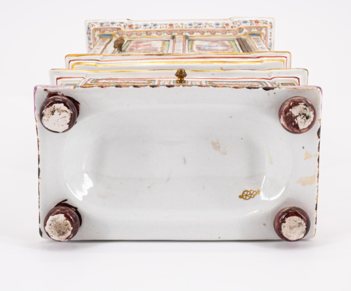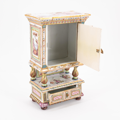 Der französische Kabinettschrank aus Fayence gehört zu den außerordentlich seltenen "ameublement de luxe", die für große Puppenhäuser in Frankreich und Russland in der Zeit Napoléon III hergestellt wurden. Das Möbel ahmt einen Barocken Kabinettschrank des 17. Jahrhunderts nach. Obwohl keine Marken vorhanden sind, darf das Möbel der Manufaktur Sèvres zugeordnet werden.