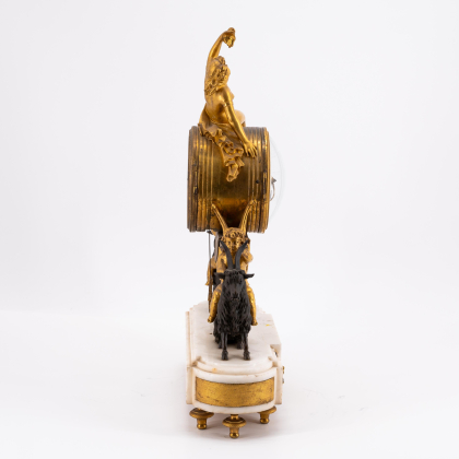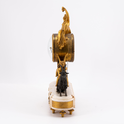 PENDULE LOUIS XVI MIT BACCHANTIN UND AMORETTEN AUF ZIEGENBÖCKEN.