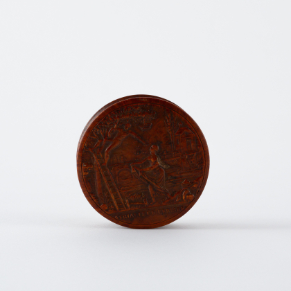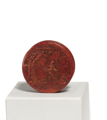 Beschreibung: Auf der Oberseite feines Flachrelief mit jungem Paar bei der Ernte von Kirschen, im