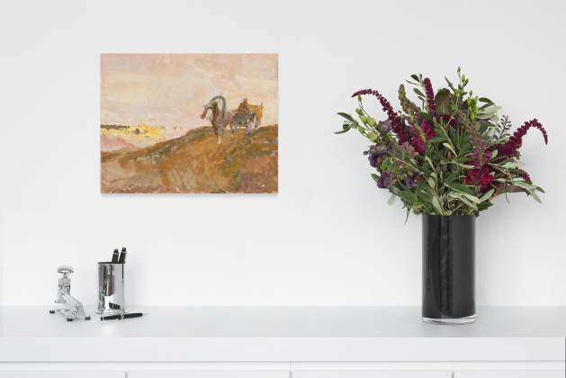 Seltener begegnen Papierarbeiten Franz Roubauds. Die Gouache (Kat. 1184) zeigt einen Pferdekarren in hügeligem Gelände mit einer am Horizont nur schemenhaft erkennbaren, goldschimmernden Stadtsilhouette. In fast monochromer Farbigkeit gelingt es Franz Roubaud mit den einfachsten Mitteln eine intensive, fremdländische Atmosphäre zu schaffen und der Fantasie eine ganze Geschichte darzubieten.