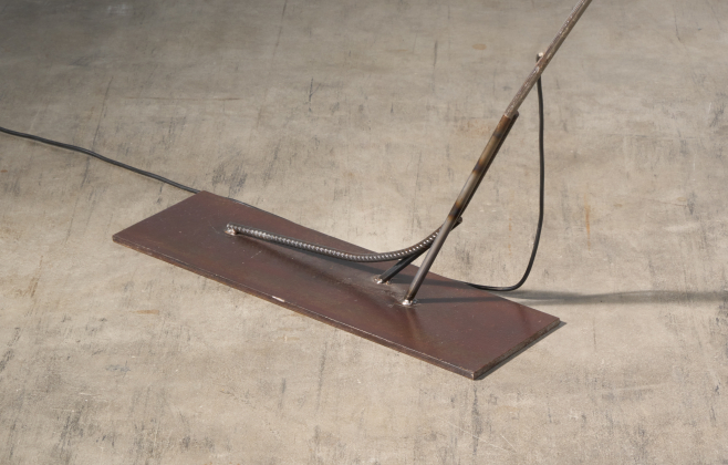 Technik: Geschweißte Eisenstäbe, Stahlplatte, Elektrokabel und Fassung.