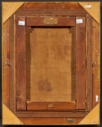 Auf dem Keilrahmen alter Klebezettel mit Beschreibung.