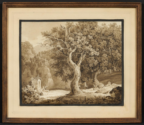 Titel: Italienische Waldlandschaft mit Gebetsstock.