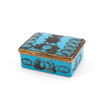 Technik: Kupferkorpus mit Maler und Reliefemail. Feuervergoldete Kupfermontierung.