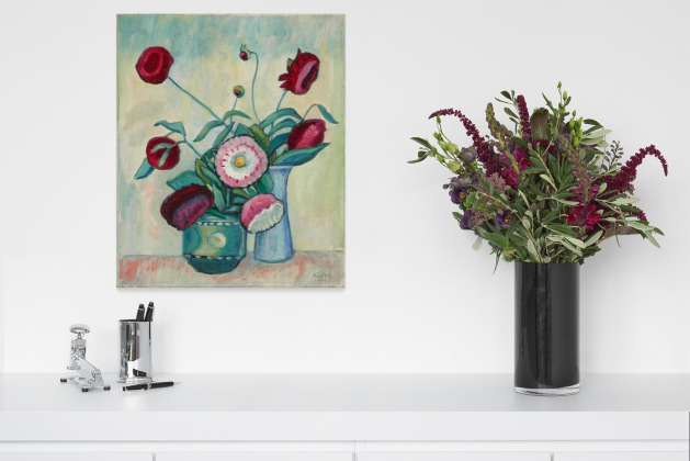 Das Stillleben "Rote Dahlien" (1946) zeigt farbintensive Blumensträuße in zwei unterschiedlich hohen Vasen. Die leuchtend roten Blüten der Dahlien setzen markante Akzente in der Bildkomposition. Auf hohen Stielen ragen sie in verschiedene Richtungen oder neigen sich sanft zur Tischplatte. Ergänzt werden sie durch weiße und rosafarbene Blüten sowie geschlossene Knospen. Mit dynamischen Pinselstrichen und vereinfachten Formen bringt Münter die Lebendigkeit der Natur auf die Leinwand. Der Kontrast zwischen den strahlenden Blüten und dem zart gehaltenen, pastellfarbenen Hintergrund verstärkt die expressive Wirkung. Die harmonische, reduzierte Komposition und die leuchtende Farbgebung spiegeln Münters späten Stil wider, der weiterhin von der expressiven Kraft der Farbe geprägt ist. Das Motiv des Blumenstilllebens nimmt in Münters Spätwerk eine besondere Rolle ein. In Zeiten politischer Umbrüche und persönlicher Herausforderungen konzentriert sie sich verstärkt auf Darstellungen der Natur und bewahrt darin ihre charakteristische Farbintensität und Ausdruckskraft.