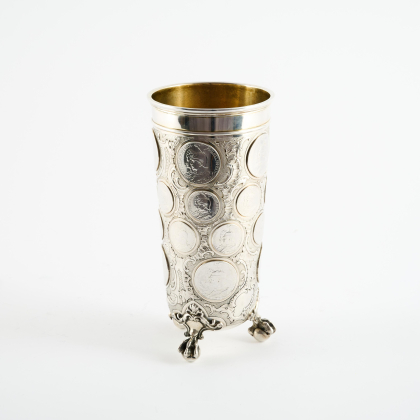 GROßER MÜNZBECHER MIT KUGELFÜßEN.