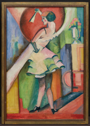 Eine Tänzerin steht an der Bühnen-Rampe. Die Figur mit dem dachziegelartig gerüschten Rock steht im Kontrapost mit keck in die Seite aufgestütztem linken Arm und erhobener Rechten in der sie einen zusammengeklappten Fächer hält. Sie schaut in das im Bild nicht sichtbare Publikum. Der Standort des Betrachters ist "back-stage", hinter ihr auf der Bühne. Am rechten Bildrand ist ein vasenartiges Art-Deko Objekt zu erkennen, das den Treppenabgang flankiert. Starkes Scheinwerferlicht bestimmt die Szene. Ein weißer, gebündelter Strahl kommt von links und trifft den Körper der jungen Frau, ohne aber ihren linken Arm zu streifen, der auf dieser vom Publikum abgewendeten Seite dunkel verschattet ist. Auch die Nase und Partien des Halses werden in dieser Ansicht nicht vom starken Licht erfasst. Dominant in diesem kaleidoskopartigen, fröhlich bunten Revue-Gemälde ist die rote Scheinwerferlicht-Scheibe, die den Kopf, Brust, (Ober-)Arme und den Fächer hinterfängt.