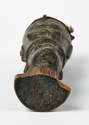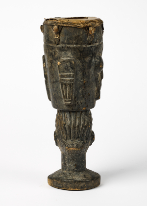 Collage: Minimale Kratzspuren. Vereinzelt leichte Bestoßungen an den Kanten. Arbeitsspuren. Minimal gebräunt. Vereinzelt Einschnitte an den Kanten (herstellungsbedingt?). Verso minimal gebräunt sowie vereinzelt minimale Bestoßungen und partiell leichte Bereibung. Trommel: Von Standfuß fehlt ein Stück und das Trommelfell hat zwei große Löcher (werkimmanent). Leichte Bereibungen und Bestoßungen an den erhabenen Stellen, vereinzelt leichte Kratzspuren (werkimmanent?). Minimale Staubablagerungen in den Vertiefungen. Ansonsten jeweils guter Zustand.