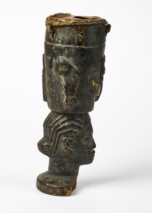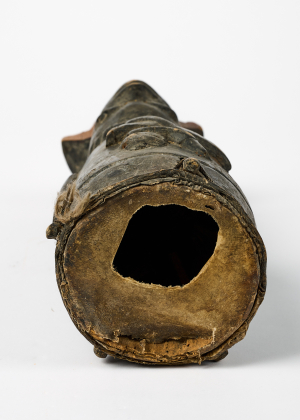 Trommelfell. Collage: 69,5 x 49,5cm. Holzobjekt: 34 x Ø 12cm.