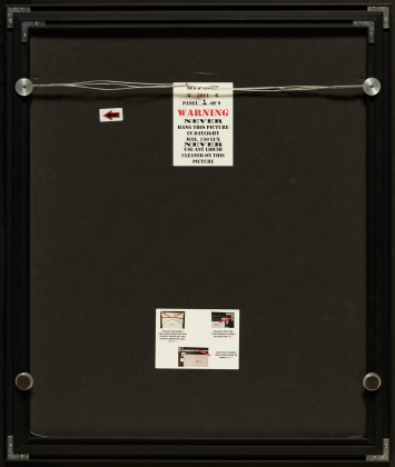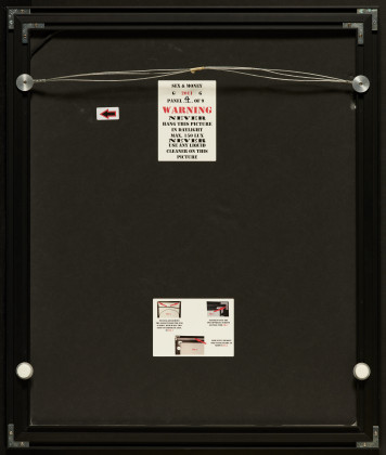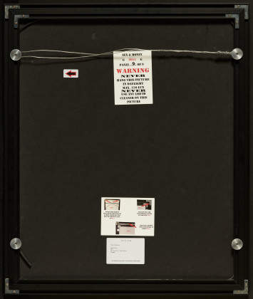 Über die Verarbeitung zahlloser Top-Schlagzeilen, deren explizite Anspielungen auf die prickelndsten, gewalttätigsten und bizarrsten Geschichten des Tages potentielle Kunden zum Kauf bewegen sollten, nehmen die Künstler eine nachhaltige Bestandsaufnahme alltäglicher menschlicher Themen vor, unterziehen diese ihrem gewohnt humanistisch geprägten Blick und lassen mit den Mitteln ihrer Kunst ein wahres Bild-Epos entstehen. Werktitel wie "BEATEN TO DEATH", "CUTE KIDS", "DOG", "KNIFE MURDER" oder wie das hier angebotene Werk "SEX & MONEY" lassen auf das heterogene und breite Themenspektrum schließen. Mit diesem Zyklus gehen Gilbert & George nicht nur dem Drama und der Gewalt ihrer Heimatstadt London auf den Grund, sondern geben darüber hinaus auch Auskunft über ihre Sicht auf die soziale Beschaffenheit unserer westlichen Gesellschaften. Die "London Pictures" sind somit nicht nur als Kritik an den Medien zu lesen, sondern darüber hinaus auch als Kritik an uns selbst. Die Künstler bedienen sich der Sprache der Medien, entheben diese ihrem eigentlichen Kontext und entwickeln daraus eine Reflexionsebene, die Raum zum Nachdenken bietet und den Blick auf unsere eigene Mitschuld, unsere Machenschaften und Problemzonen lenkt. Auch die Künstler selbst treten in den Bildern auf: Meist als kritisch-fragende Protagonisten im Hintergrund, machen sie sich unmittelbar zum Bestandteil der Medien- und Seelenlandschaft unserer Gesellschaft und wirken fast wie das moralische Porträt ihrer Stadt. Ihre Blicke hinterfragen dabei nicht nur die Botschaften der Werbeplakate, sondern auch die menschlichen Dimensionen dahinter. Parallel dazu richten sie sich in jedem Werk auch an die Betrachtenden, die somit ebenfalls zu einem direkten Teil jeder einzelnen Arbeit werden. Die Worte "IT'S WRITTEN ALL OVER THEM", die jedes Bild rechts unten in der Signatur trägt, gelten für die Künstler wie für die Betrachtenden und jedes Mitglied der westlichen Gesellschaft gleichermaßen.