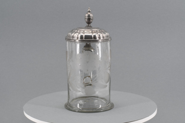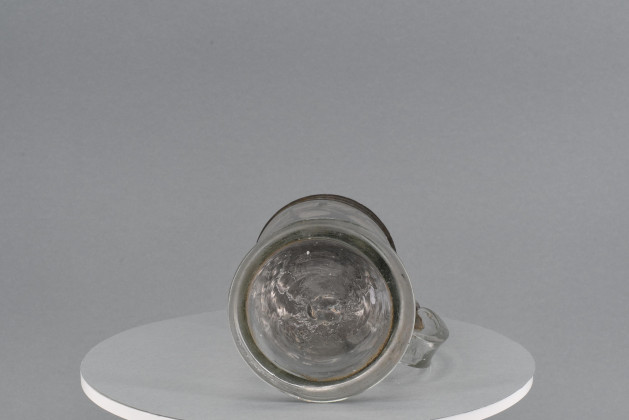 Beschreibung: Großer Glashumpen mit angeschmolzenem Bandhenkel und Zinndeckel. Zylindrische Wandung mit
