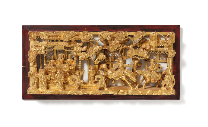 Los 523 | Gruppe von vier Paneelen mit reich geschnitzten Figuren in Gartenlandschaften