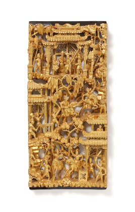 Sie wollen ein Objekt von Gruppe von vier Paneelen mit reich geschnitzten Figuren in Gartenlandschaften verkaufen?