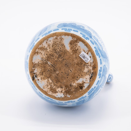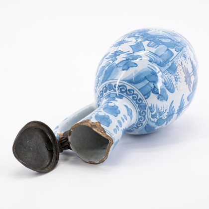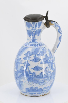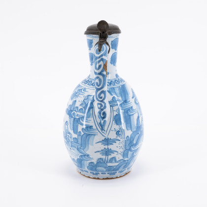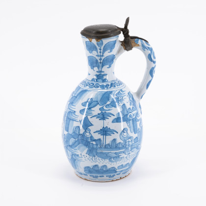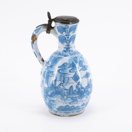 Technik: Beiger Scherben, weiße und blaue Glasur. Scharnierter Zinndeckel.