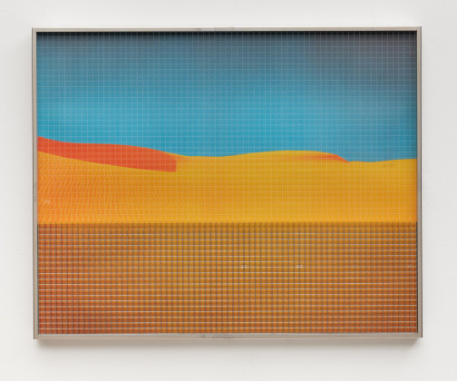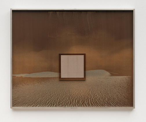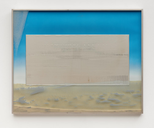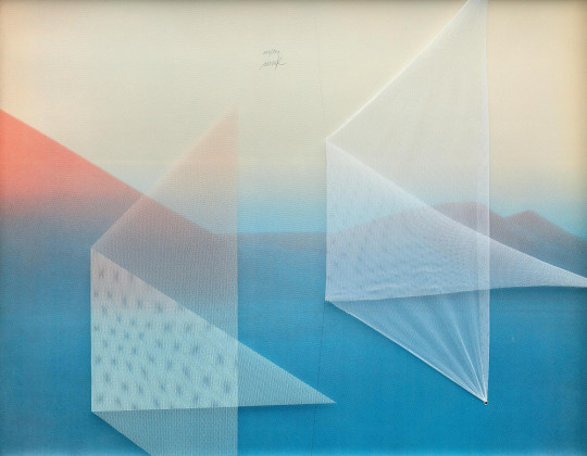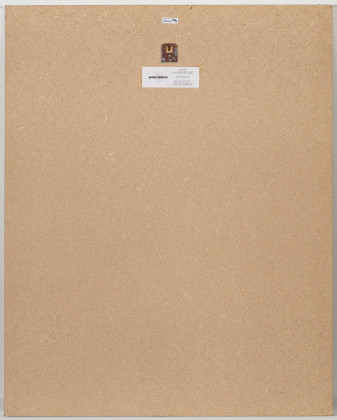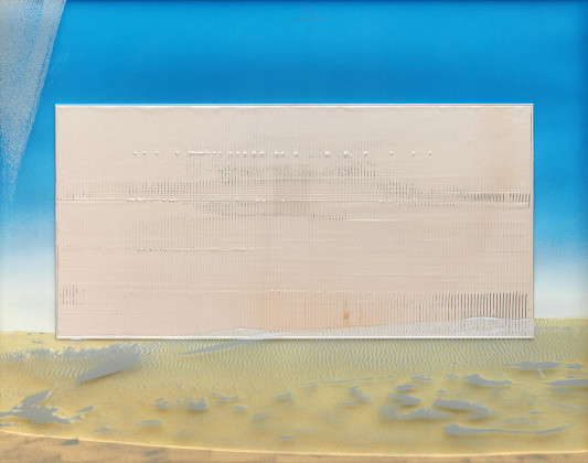 Technik: Sieb- und Irisdrucke auf leichtem Karton. Zum Teil mit unterschiedlichen Materialien collagiert u.a. mit geprägter Aluminiumfolie, Kunststoffgitter, Nylonnetz, Drähte, Sand, Plexiglasscheibe.