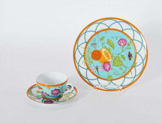 Beschreibung: Türkise Teetasse, Untertasse und Frühstücksteller.