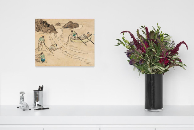 Bei dem Werk handelt es sich um eine Vorstudie zu dem Gemälde "Netzwäscher" (siehe Soika WVZ.-Nr. 1917/45) sowie zu der Lithografie "Das Netz. Italienische Fischer IV" (siehe Krüger WVZ.-Nr. L 182).