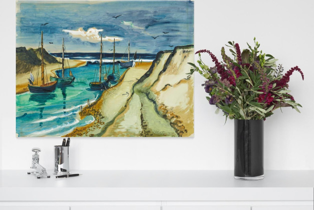 Das hier angebotene Werk "Lupowmündung" wurde 1931 von Max Pechstein in dem Fischerdorf Rowe an der Mündung des Flusses Lupow in Ostpommern gemalt. Seit 1921 reist er regelmäßig nach Pommern, um dort einige Monate fernab der hektischen Großstadt Berlin zu verbringen. Gleich im ersten Jahr lernt er in Leba seine zweite Frau Marta Möller kennen. Wäre die neue Grenzziehung im Nachkriegseuropa nicht gewesen, wäre Pechstein sicherlich dauerhaft in sein geliebtes Nidden gezogen. Stattdessen wurde Nidden nun zu Litauen gezählt und so war Pechstein gezwungen, sich ein neues Paradies zum Malen zu suchen. Wie Nidden ist auch die Landschaft um Leba von riesigen Sandbänken geprägt, und die dreißig Kilometer langen Dünenlandschaft an der Küste, unterbrochen von gelegentlichen Fischerhütten, boten Pechstein reichlich Gelegenheit, seine dramatischen Erkundungen der Natur fortzusetzen. Bis 1927 hält er sich regelmäßig im Sommer in Leba auf. Bei Wanderungen und Erkundungen der Umgebung stößt er dann 1927 auf das Fischerdorf Rowe. Die kommenden Jahre verbringt er seine Aufenthalte in Pommern überwiegend dort. Aber wie schon zuvor in Leba soll er sich 1933 auch aus Rowe zurückziehen, da durch den zunehmenden Tourismus, die von ihm gesuchte naturbelassene Idylle, zerstört wird.