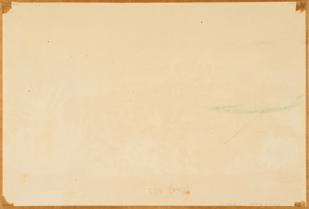 Ungleichmäßig gebräunt. Farben im ehemaligen Passepartoutausschnitt geblichen. Verso umlaufend Reste alter Montierung. Farbspuren. Einzelne punktuelle Stockflecken. Ansonsten guter Zustand.