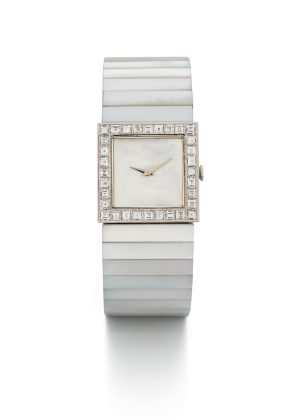 Gehäuse/Armband: 750/- Weißgold mit Diamantbesatz, 32 Diamanten im Karree-Schliff zus. ca. 3,2 ct., Gliederarmband mit Perlmuttauflage, Zffbl. Perlmutt, Zeiger silbern.