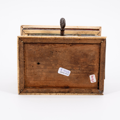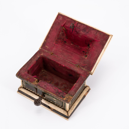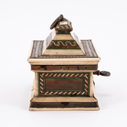 Beschreibung: Rechteckige Form mit stufenförmig ansteigendem Deckel.. Allseitig Einlagen aus Knochen,