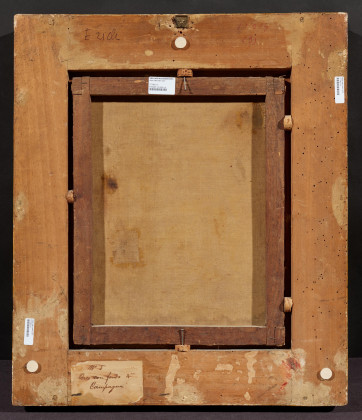 Auf dem Keilrahmen alter Klebezettel mit Angaben zur Darstellung.