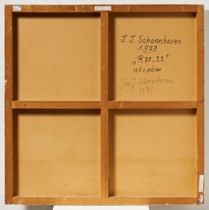 Bezeichnung: Signiert, datiert, betitelt und bezeichnet verso oben rechts: J. J. Schoonhoven 1973 "R73-22" 106 x 106cm. Darunter nochmals signiert und datiert.