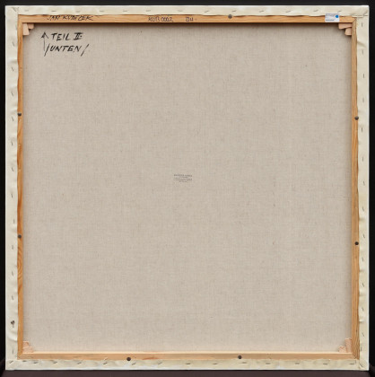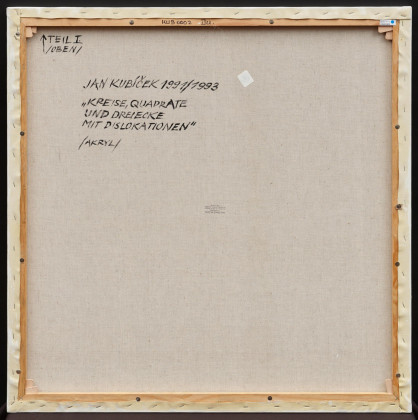 Bezeichnung: Signiert, datiert, betitelt und bezeichnet verso auf der oberen Tafel oben links: JAN KUBICEK 1991/1993 "KREISE, QUADRATE UND DREIECKE MIT DISLOKATIONEN" (AKRYL). Signiert verso auf dem Keilrahmen der unteren Tafel: JAN KUBICEK. Zudem beide Tafeln verso oben mit Richtungspfeil und Angaben der Anordnung versehen.