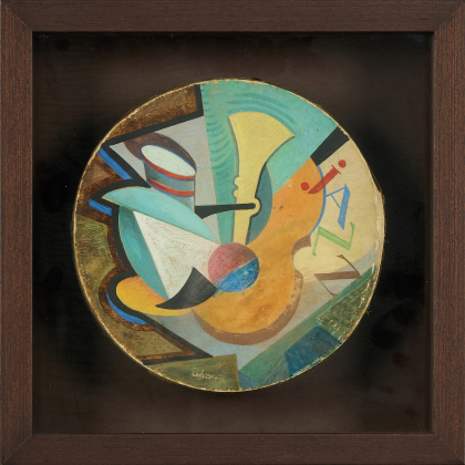 Jenö Gábor Ungarn Moderne Kunst Unikate 1920er Kastenrahmen (jeweils: 30 x 30 x 7cm) Musikinstrument Gemälde Öl Schrift