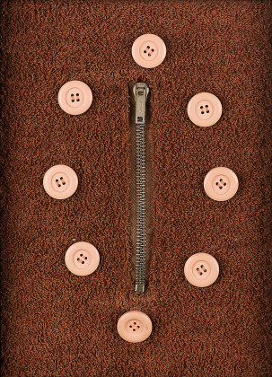 Technik: Künstlerbuch, bespannt mit Frottee, benäht mit Knöpfen und einem Reißverschluss. In Rahmen montiert.