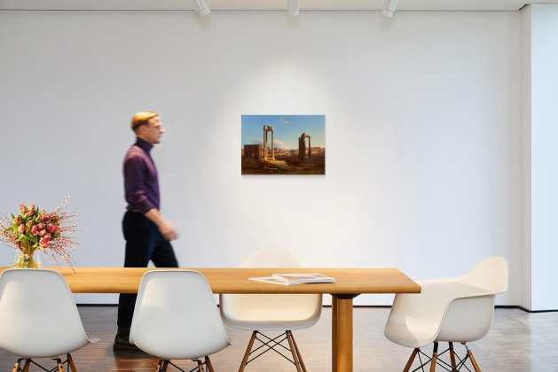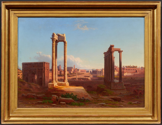 Diese Kombination aus präziser Widergabe der universellen Kulturstätte Rom mit Erfüllung der ewigen Sehnsucht nach dem Süden, dem Licht und dem Leben Italiens war das Lebensthema des Schweizer Malers Johann Jakob Frey. Hierin war er Meister und wurde sowohl von seinen Zeitgenossen als auch heute, bald 200 Jahre später, hochgeschätzt. Ab Mitte der 1830er Jahre lebte er in Rom und erkundete die Stadt und das Umland zusammen mit den Malergrößen Johann Anton Koch und Johann Christian Reinhard. Große Bekanntheit, Anerkennung und Wertschätzung der ausländischen Reisenden, des Adels und der Königshäuser erzielte er spätestens ab 1845, als er von einer archäologischen Expedition Preußens nach Ägypten zurückkam. Die hier gezeigte Abendstimmung am Forum Romanum stammt aus dem Jahr 1859, auf dem Zenit seines Erfolgs und zeigt seine ganze malerische Perfektion.