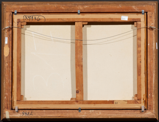 Auf dem Keilrahmen Etikett mit Zollvermerk.