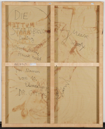 Bezeichnung: Signiert und datiert verso oben links: JMeese 2004. Betitelt oben rechts: DIE STAATSBIOLOGIN "Darling" (eingekreist). Zudem bezeichnet: störet meine Kreise nicht im Namen vom 10. Elementyssys "DR. GOTTYS".