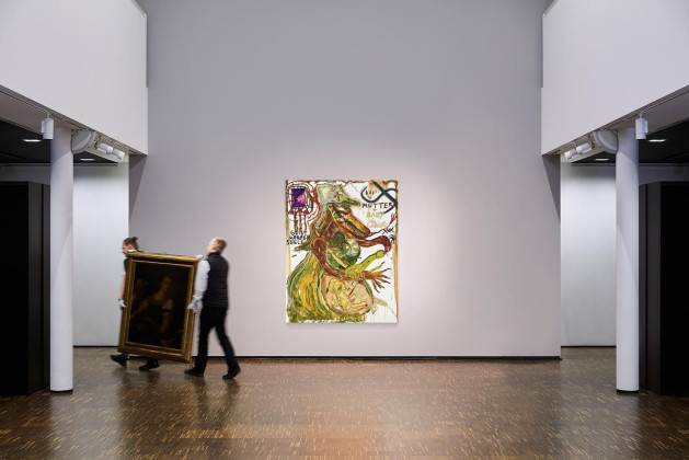 Dies gilt auch für die gezeigte Leinwand "Die Staatsbiologin - "Darling"" von 2004. Auf der weißen Bildfläche erstreckt sich in breiten braunen und grünen Pinselstrichen eine dinosaurierartige Figur. Den Betrachtenden wird ein Blick in das Innere des schwangeren, scharfzahnigen Monsters gewährt, in dem ein menschliches Baby heranwächst. Die Schwangerschaft, sowie die Worte "Mutter + Baby de Large" scheinen die Kreatur als weiblich auszuzeichnen und doch entspringt dem trächtigen Leib ein männliches Geschlechtsorgan. Eine körperlose Kralle greift nach der werdenden Mutter, die von wenigen symbolhaften Linien und Formen umringt ist. So stellt dieses Werk ein typisches Beispiel für die wirre Schaffenskraft Meeses dar.