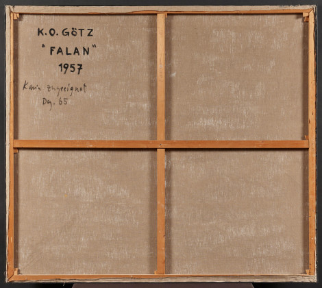 Bezeichnung: Signiert unten links: K.O. Götz. Zudem signiert, betitelt und datiert verso oben links: K.O.GÖTZ "FALAN" 1957. Darunter bezeichnet: Karin zugeeignet Dg. 65.