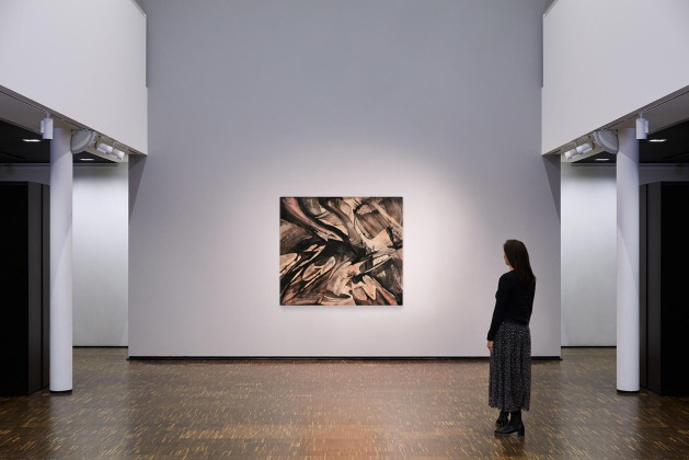 In der großformatigen Arbeit "Falan" gelingt Götz eine unglaublich energiegeladene, explosive Komposition. Die großzügigen dunklen Schwünge auf rosé-beigem Fond streben zur dunklen Bildmitte, der man sich kaum entziehen kann. Götz wählt bewusst eine reduzierte Farbigkeit zugunsten einer sog-artigen Dynamik. Die hellen und dunklen Farbbereiche sind sorgfältig ausgewogen angelegt, wenngleich die Bewegungen alle zum Zentrum hinstreben. Nichts bleibt dem Zufall überlassen und doch schwingt eine Leichtigkeit mit, die von besonderem ästhetischem Reiz ist.